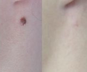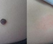 Also known as fibroma pendulum, a skin tag is a benign (non-cancerous) soft area of skin that hangs off the body. Technically a tumor, skin tags are made up of collagen fibers, capillaries, lymphatic vessels, a core of ducts, fat cells, nerve cells and are covered by the epidermis. Caused by bunches of trapped blood vessels and collagen inside thicker parts of the skin, they are usually flesh colored, about the size of a grain of rice or bigger, and look like a little flap of skin connected to the body by a small stalk of tissue called a peduncle. Known to doctors as acrochordons, the most common areas where they occur are in the folds of your skin, such as the eyelids, neck, groin under arms and upper chest, but can also be found elsewhere on the body. While it can be alarming to see any kind of growth on your skin, these growths are typically harmless.